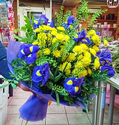 Необычное сочетание цветов в этом букете делает его очень оригинальным и уникальным. Насыщенно-фиолетовые ирисы, олицетворяющие на языке цветов отвагу и мужество, в сочетании с ярко-желтыми солидаго, создают невероятную контрастную композицию, а дополнительное украшение из зелени салала делает ее еще более насыщенной. Этот поистине джентельментский букет станет универсальным подарком на любой праздник или просто в обыденный день, а также поможет получателю забыть все обиды.